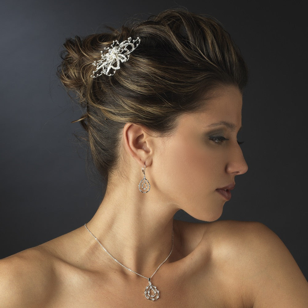 SKU:Simple and exquisite, this stunning floral hair comb features intricate silver detailing swirling in elegance and encrusted with dozens of brilliant rhinestones that really sparkle. This gorgeous hair comb would be fabulous for weddings, proms or any formal affair! Adornment rests on a 1.25" comb.