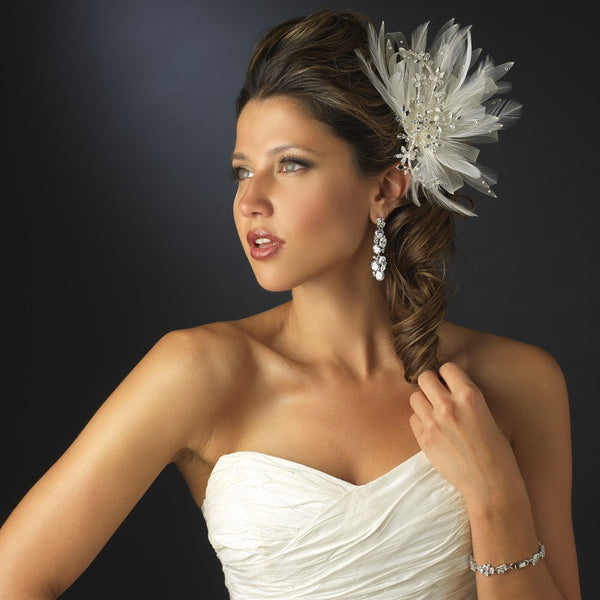 Ivory Mesh Feather Fascinator Bridal Wedding Hair Clip with Clear Rhinestones & Swarovski Crystal Beads