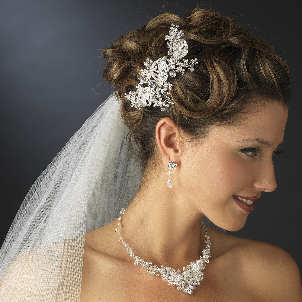 Silver Clear Rhinestone & Swarovski Crystal Bead Floral Vine Bridal Wedding Hair Comb