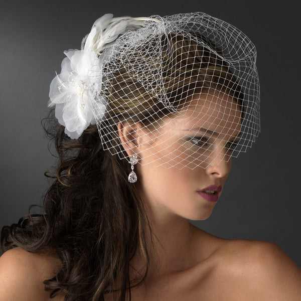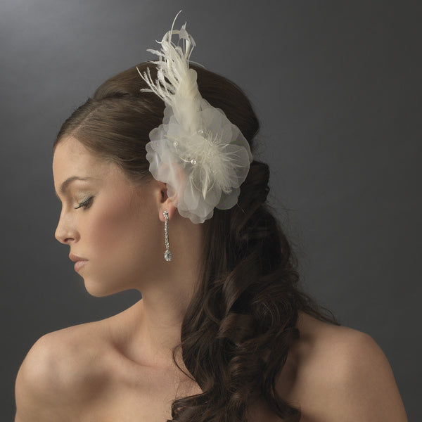 SKU:A remarkable and modern addition to your bridal hairstyle, this feather fascinator features a translucent fabric flower with a Swarovski crystal and silver plated flower detail. Stunning feathers spray to the right side of the piece, and the ornament rests on a 3" comb.