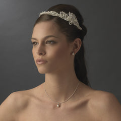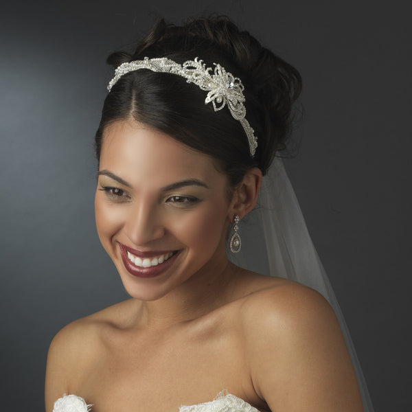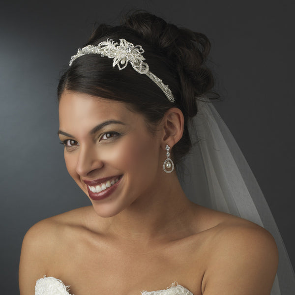 SKU:Elegant with a classy touch, this beautiful headband style headpiece has beautiful ivory pearl accents covering the majority of this piece, along with a stunning rhinestone encrusted flower accents, tilted slightly off to the side of the band. This is a sparkling choice to select for your modern and couture touched wedding celebration.