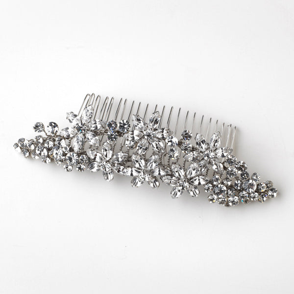 Composed of rhodium plating, this comb features lovely floral design decorated with dazzling marquise clear rhinestones arranged in an alternating pattern. This beautiful piece is a perfect accessory for up do's...